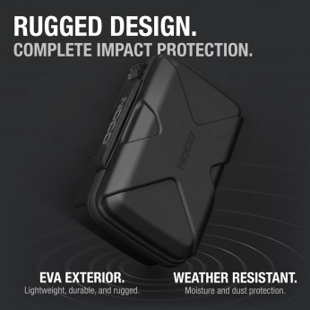 Η ελαφριά, ανθεκτική και στιβαρή προστατευτική θήκη GBC102 EVA έχει ημιάκαμπτο προσαρμοσμένο εξωτερικό περίβλημα με κλείσιμο με φερμουάρ και ενισχυμένη λαβή. Το εξωτερικό περίβλημα EVA από καουτσούκ προσφέρει προστασία από υγρασία, κρούσεις, σκόνη και άλλους περιβαλλοντικούς παράγοντες, ενώ το χυτευμένο εσωτερικό ταιριάζει τέλεια, αποθηκεύει και προστατεύει τους αντίστοιχους εκκινητές μπαταριών λιθίου NOCO Boost X UltraSafe GBX55 (πωλείται χωριστά). Η θήκη GBC102 διαθέτει πρόσθετες τσέπες για τη μεταφορά των σχετικών εξαρτημάτων εκκίνησης (πωλούνται χωριστά). Αποθηκεύστε την προστατευτική θήκη εύκολα στο πορτμπαγκάζ, το όχημα, την κονσόλα ή το γκαράζ σας.